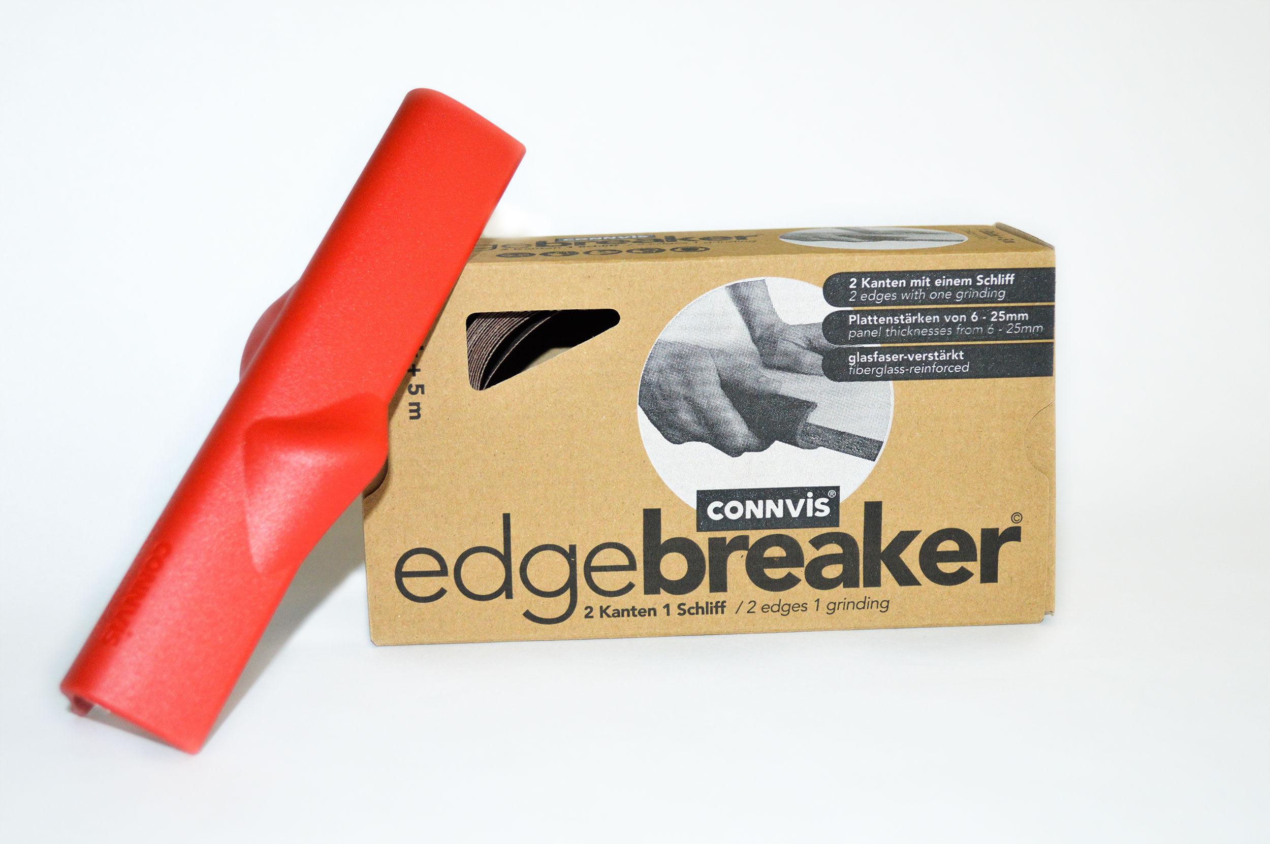 Für Plattenstärken von 6-25mm ist unser ergonomisch gestaltetes Produkt perfekt. Ob Möbelbau, Holzbearbeitung oder DIY-Projekt; der connvis Edgebreaker ist die ideale Lösung zum Entgraten, Kantenbrechen und Schleifen von Holzplatten, MDF oder Multiplex.